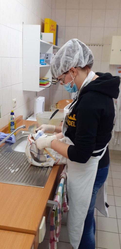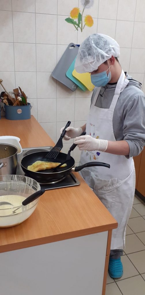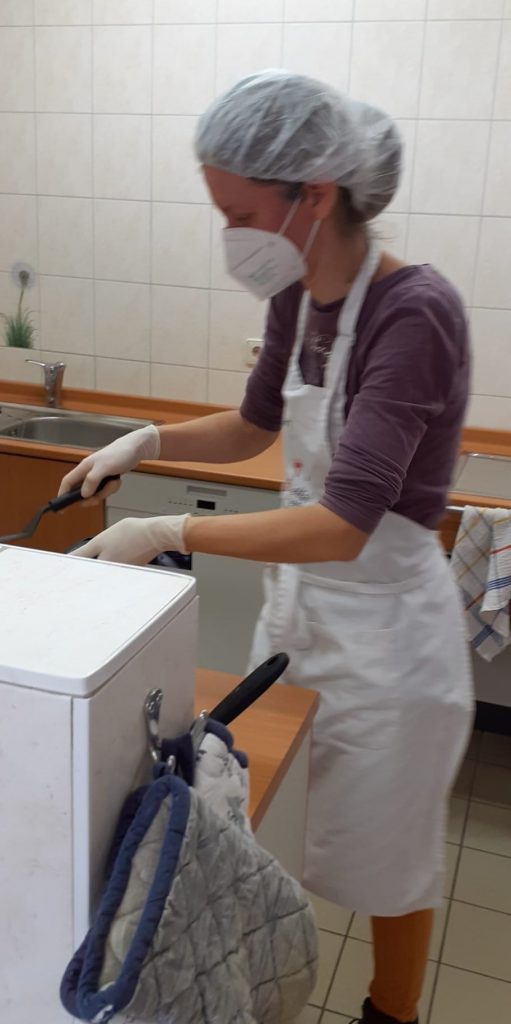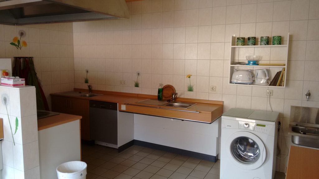 In der kleinen, aber sehr funktional eingerichteten Küche werden von den Schüler/Innen im Rahmen des wöchentlichen Hauswirtschaftsunterrichts je nach Klassenstufe kleine Snacks oder ganze Mittagsmahlzeiten zubereitet. Herd und Spüle sind höhenverstellbar und somit auch für Rollstuhlfahrer problemlos zugänglich. Auch für das Erlernen der Wäschepflege stehen alle notwendigen Gerätschaften zur Verfügung.